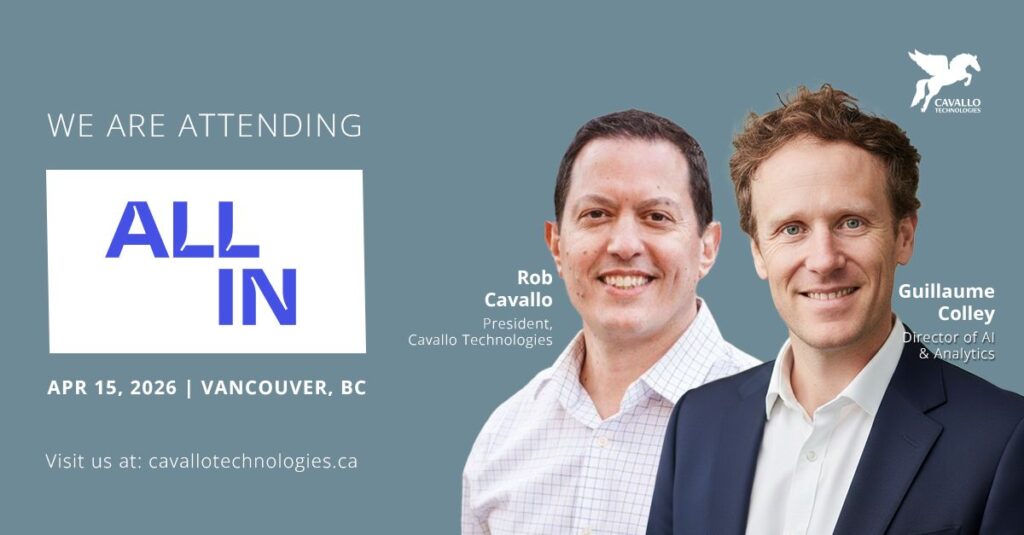 At Cavallo, we’re passionate about applying Data + AI solutions to transform industries. From energy and utilities, to shipping and transportation networks moving goods coast to coast, to financial services, healthcare, education, and retail. ALL IN Talks West is the stage to exchange these ideas, learn from peers, and forge the collaborations that turn AI ambition into real-world impact. From Calgary to Vancouver, the West is home to some of Canada’s most data-rich, innovation-ready sectors, and we’re here to help them lead.